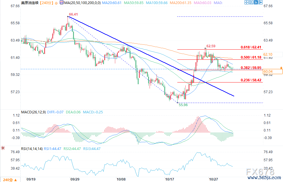 汇通财经APP讯——周四(10月30日),WTI原油期货小幅走低,价钱未能延续周三的小幅反弹,价钱在要道本事阻力位下方停滞。50日均线为59.85好意思元,不时狂妄上行势头,最近的波动高点为62.59好意思元。